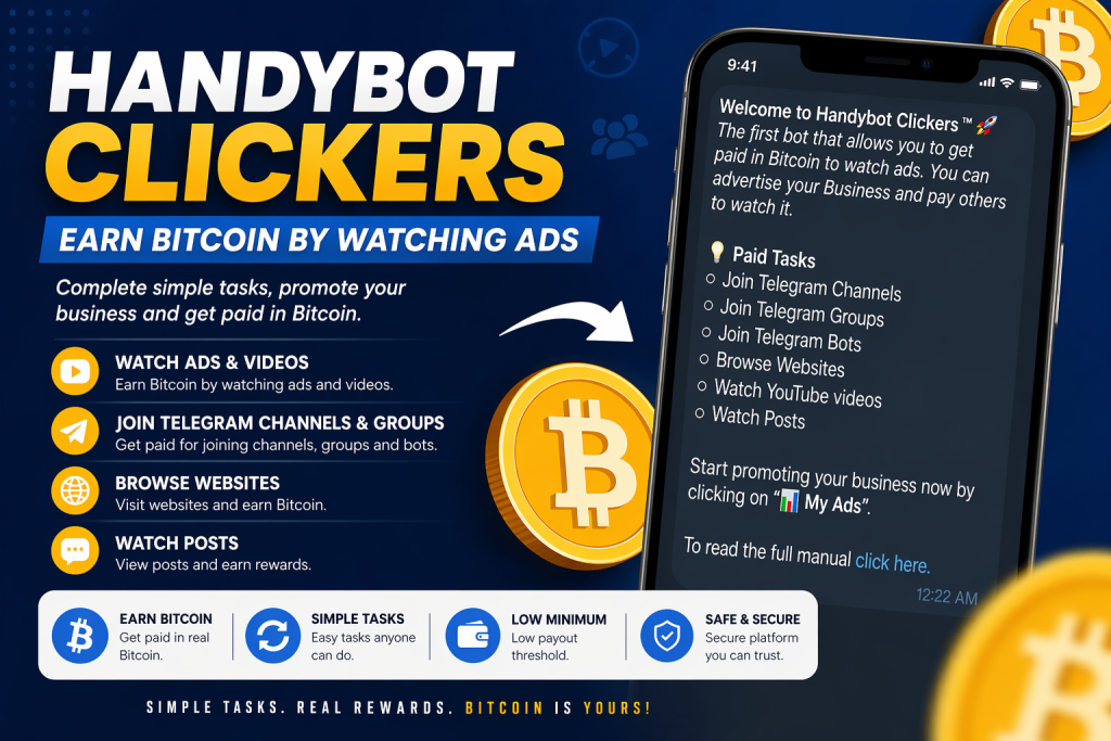 Handybot Clickers is a bot-based earning platform that rewards users with Bitcoin for completing basic online activities. Unlike traditional freelancing platforms, it focuses on micro-tasks that require little to no experience.